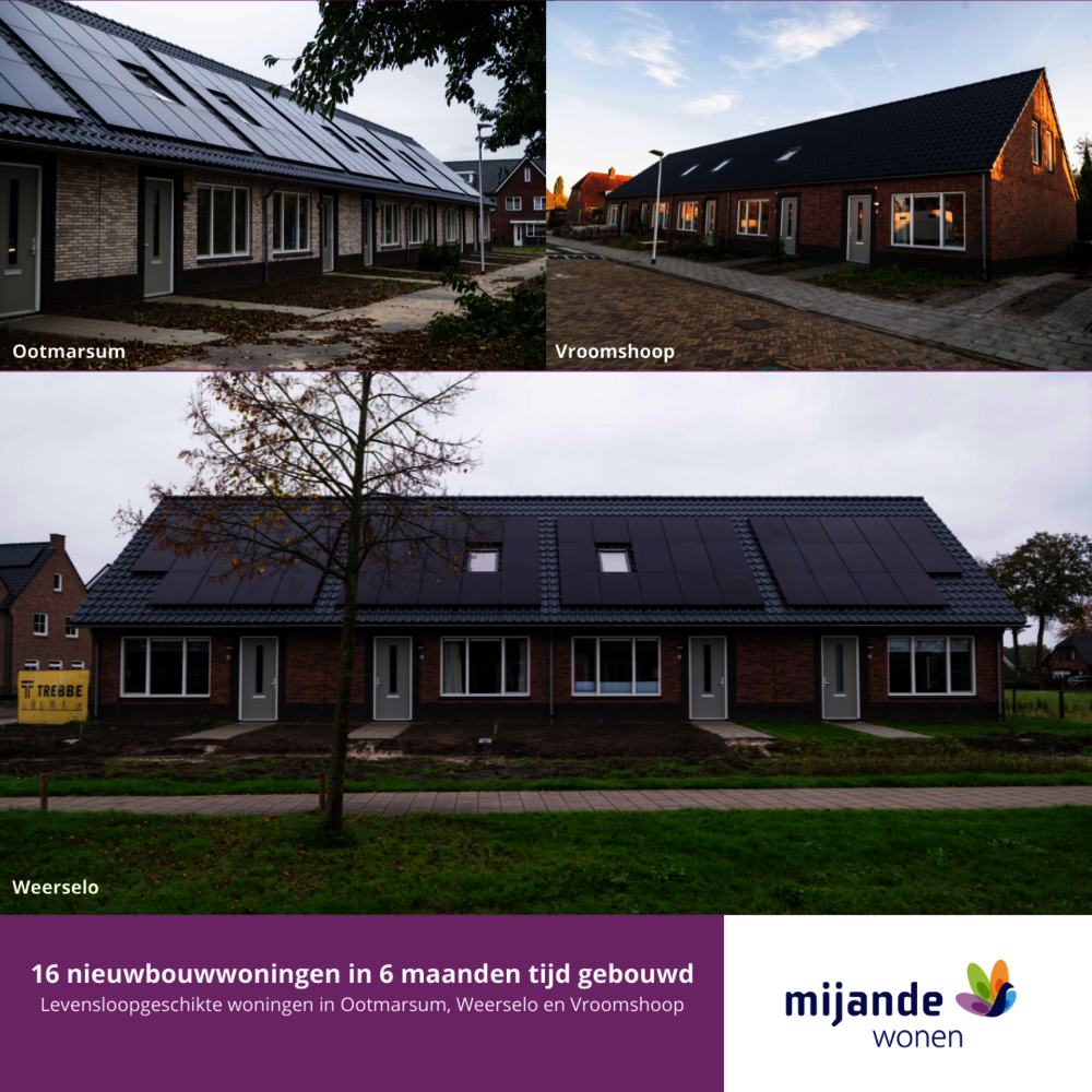 Door op deze manier te bouwen lukt het om in korte tijd 16 woningen te bouwen en op te leveren. Bovendien is er geen grootschalige bouwplaats inrichting nodig. Veel elementen komen aan op de bouwplaats en worden meteen op de juiste plek gezet. Er is weinig tot geen opslag nodig en de overlast voor omwonenden is beperkt. Verder voldoet deze manier van bouwen aan de BENG eisen en krijgen bewoners straks een fijne, goed geïsoleerde woning. Natuurlijk met zonnepanelen en een warmtepomp.